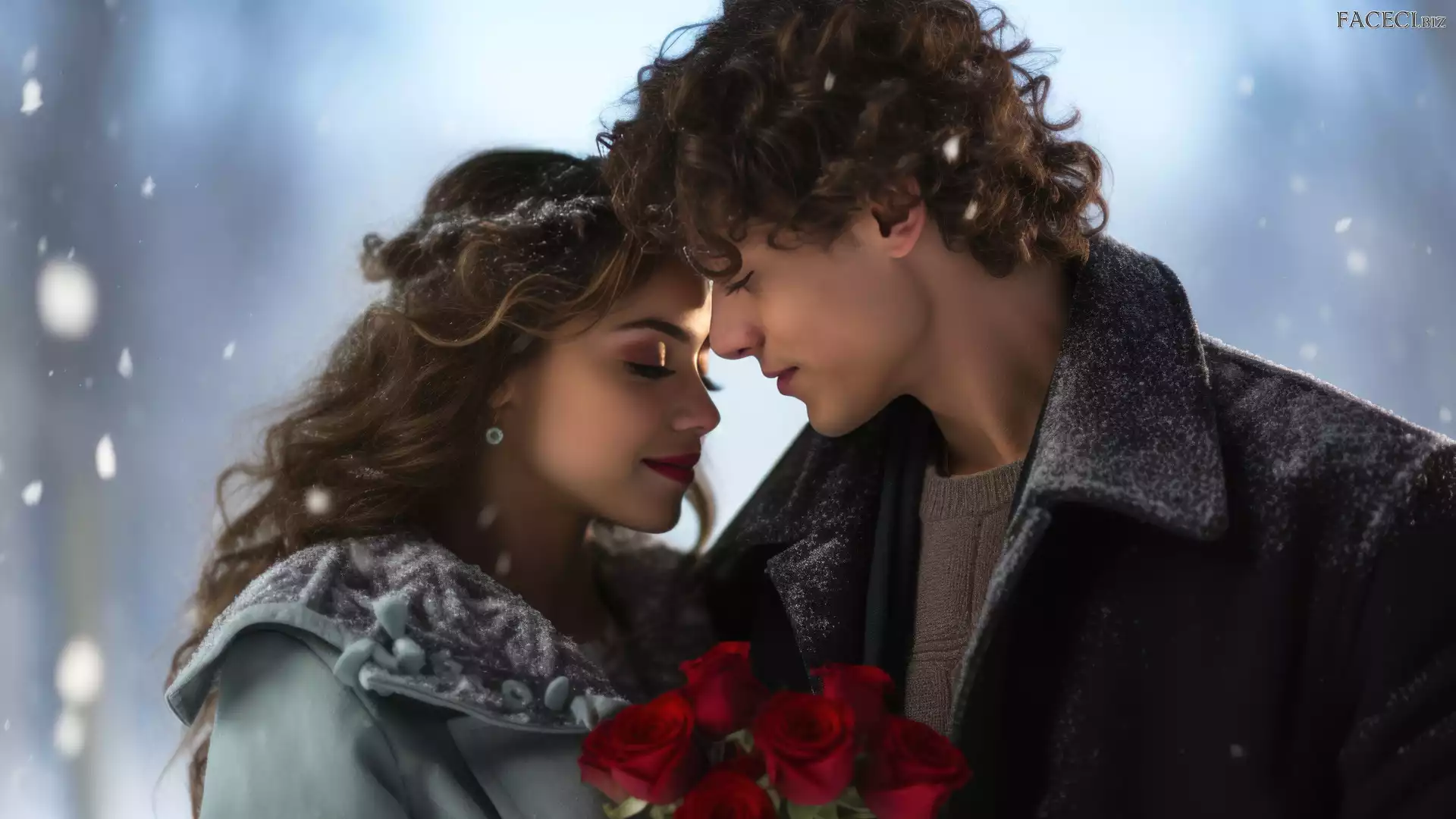 Para, Róże, Mężczyzna, Bukiet, Zima, Grafika, Zakochani, Kobieta, Śnieg, Czerwone - faceci.biz